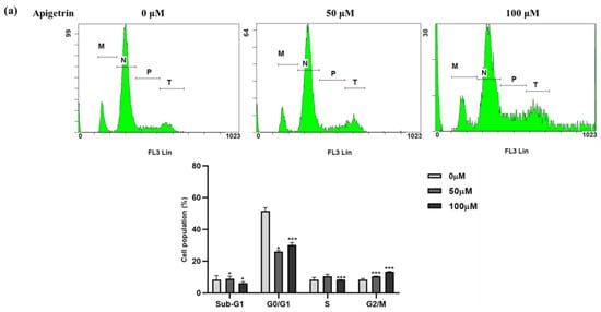 PI staining and flow cytometry were used to investigate the cell cycle distribution. HepG2 cells (5 × 105 cells/well) were seeded in 60 mm plates and subjected to various concentrations of apigetrin (0, 50, and 100 μM) for 48 h. The cells were collected, fixed with ice-cold 70% ethanol, and stored at −20 °C and taken for analysis. After fixation, the cells were rinsed twice with cold PBS and centrifuged. The pellet was resuspended in PBS containing 50 μg/mL PI and 0.1 mg/mL RNaseA and stained for 20 min in the dark. The content was analyzed with flow cytometry on a Cytomics FC 500 (Beckman Coulter, Brea, CA, USA). In each sample, approximately 10,000 cells were sorted. The data obtained were analyzed using CXP Software (Beckman Coulter, Inc., Fullerton, CA, USA).