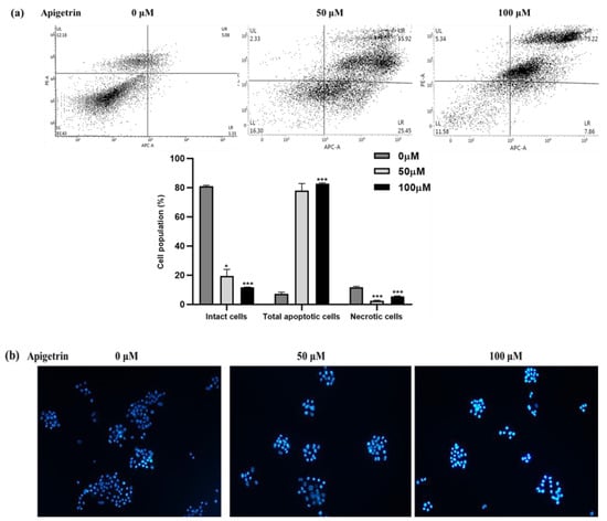 Apigetrin caused apoptosis in HepG2 cells. (a) To quantify apigetrin-induced apoptosis in HepG2 cells, double staining was performed at indicated concentrations (0, 50, and 100 µM) for 48 h. The data are presented as the mean ± standard error of mean (SEM) * p < 0.05, *** p < 0.001. (b) DAPI staining was performed to observe fragmented chromatin under a fluorescence microscope.