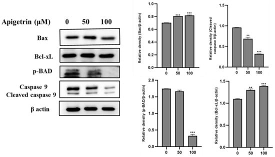 Mitochondrial signaling pathway analysis treated upon apigetrin. Apigetrin was administered to HepG2 cells at a dosage of (0, 50, and 100 µM) for 48 h. Cells were collected, and proteins were harvested by immunoblot. Bax, Bcl-xL, p-BAD, and cleaved caspase 9 were quantified by Western blot. The results obtained from three independent experiments are expressed as mean ± standard error of mean (SEM) and compared with the control group. ** p < 0.01, *** p < 0.001.