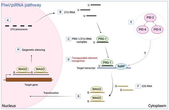 - Placentino, M.; Domingues, A.M.D.; Schreier, J.; Dietz, S.; Hellmann, S.; de Albuquerque, B.F.M.; Butter, F.; Ketting, R.F. Intrinsically disordered protein PID-2 modulates Z granules and is required for heritable piRNA-induced silencing in the Caenorhabditis elegans embryo. Embo J. 2021, 40, e105280. [Google Scholar] [CrossRef]