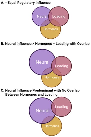 Potential regulatory relationships between mechanical loading, sex hormones, and neural elements in the regulation of bone. The three panels (A–C) represent examples of such relationships where the size of the circle and the overlap between circles indicate variation in regulatory influence, as well as potential integration. Such relationships may vary between the sexes, within the sexes (particularly in females and possibly due to genetic heterogeneity in humans), and at different time points during the life cycle, so there may not be a single set of relationships for bone in different environments and locations. This figure was prepared in BioRender.