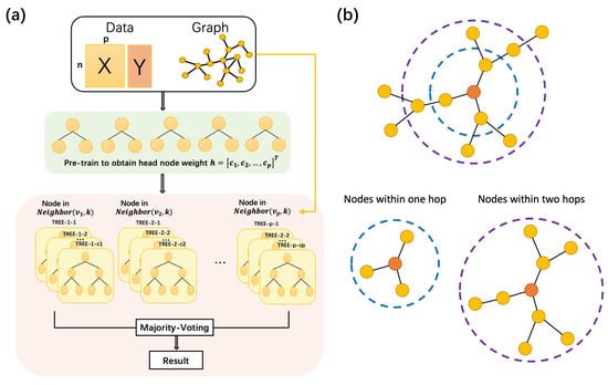 (a) The overall architecture of Graph Random forest; (b) Visualization of one-step hop vicinity and two-step hops vicinity.