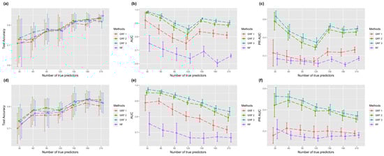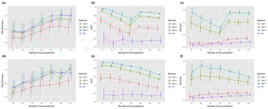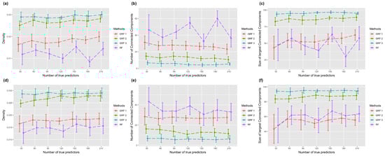 Figure 2 shows the results with logistic link function. The first row demonstrates the performance with a true sub-graph extended from one core node, and the second row shows the results of a true sub-graph extended from two core nodes. The error bar represents the estimated standard deviation estimated from ten experiments. Figure 2a,d show the test accuracy using RF and GRF with hopping steps 1, 2, and 3. In the case of one core node, GRF with hopping step 3 had the highest test accuracy when the number of true predictors was less than 100, and GRF 2 was higher when the size of true predictors grew larger. RF achieved the highest score in the setting with 210 true predictors. In the case of two core nodes, GRF with hopping steps 2 and 3 achieved the highest score in more than half of the cases. In general, when the hopping step was set to one, the test accuracy was lower compared to random forest. However, when the hopping step was set to two, both methods showed similar performance. Notably, when the hopping step was increased to three, our method outperformed random forest in terms of performance. Overall, there is minimal variation in test accuracy among the different methods, and an upward trend in prediction accuracy is evident as the number of true predictors increases.