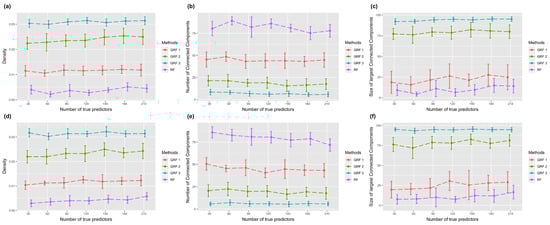 To explore the property of the sub-graph, which consists of high-ranking features, we selected the top 100 most important features and extracted their connections from the simulated network. Figure 4 shows the sub-graph density, number of connected components, and size of the largest connected component in the setting with the logistic link function. The two rows correspond to settings of the true sub-graph extended from one or two core nodes. Figure 4a,d show the graph density, which is defined as the ratio between the number of edges and the number of all possible edges. A larger density indicates a more connected graph. Results show that GRF has a larger density in all experiments. Figure 4b,e present the number of connected component. A connected component means each pair of nodes in the component are connected through a certain pathway. A graph with more connected components indicates it is more scattered. Figure 4c,f show the size of largest connected component in different experiments. It is clear from the results that sub-graphs selected by RF are more separate, and the largest connected components are smaller. On the contrary, sub-graphs generated using GRF are highly connected and have large connected components. When the hopping step equals two or three, the largest connected component contains more than 80 nodes in different experimental settings. Results of using the absolute link function are shown in Figure 5, which demonstrate similar patterns.
