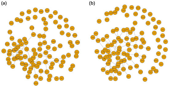 Sub-graph selected by GRF on real dataset. (a) On non-small cell lung cancer dataset; (b) On human embryonic stem cell dataset.