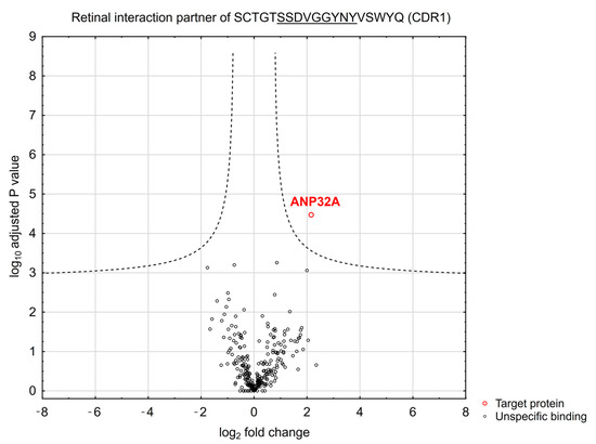 To elucidate the neuroprotective mode of action of the synthetic CDR1 peptide (SCTGTSSDVGGYNYVSWYQ), we screened for potential interaction partners in the retina proteome using CDR1-specific immunoprecipitation experiments. This state-of-the-art MS-based technology enabled the identification of direct protein interaction partners of largely unexplored biological compounds and was already successfully applied by our group for target structure (biomarker) identification [8,11]. For this reason, we immobilized the synthetic CDR1 peptide on magnetic beads by biotin-streptavidin conjugation and performed a protein enrichment from retinal protein homogenate. For differentiation and exclusion of unspecific protein binders, we also considered a biotin-labeled control (CTRL) bead group in this experiment. After enrichment of the protein binders, the eluate fractions of both bead groups (CTRL and CDR1) were subjected to further proteomic MS analysis. Employing the statistical analysis of the quantitative proteomic data, we verified the significantly enhanced enrichment of acidic leucine-rich nuclear phosphoprotein 32A (ANP32A) by the CDR1-labeled magnetic beads in comparison to unlabeled CTRL bead group (n = 3, p < 0.001 and log2 fold change > 3, see Figure 2 and Table S2). This result indicates that the synthetic CDR1 peptide seems to interact physically with retinal protein ANP32A.