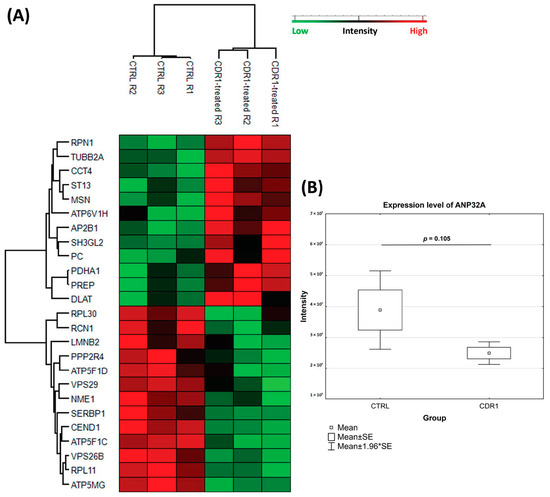 Quantitative proteomic analysis of CDR1-treated retinal explants (100 µg/mL) compared to untreated controls (CTRL). (A) Heatmap showing the expression levels of proteins, which were significantly differentially expressed between both experimental groups (CTRL and CDR1, p < 0.05). (B) Expression levels of acidic leucine-rich nuclear phosphoprotein 32A (ANP32A), which was identified as a potential interaction partner of synthetic CDR1. The protein levels of ANP32A were slightly diminished in the CDR1-treated retinal explants compared to untreated CTRL but were not supported by statistical significance (p = 0.105).
