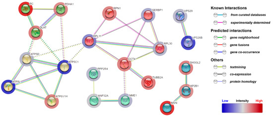 For elucidation of the molecular modes of action of the synthetic CDR1 peptide (SCTGTSSDVGGYNYVSWYQ), we employed a quantitative MS-based proteomic analysis of the retinal explants ± CDR1 treatment (n = 3 for each group). Due to increased neuroprotection on RGCs ex vivo in a concentration-dependent manner of synthetic CDR1, we selected a peptide concentration of 100 µg/mL for this experiment. In summary, 1040 proteins were identified in the retina of both experimental groups (CTRL and CDR1) using a false discovery rate (FDR) <1% (see Table S3). Up to 3% of these proteins showed a significant level change between both groups (p < 0.05), indicating 12 high abundant and 13 low abundant protein markers in the CDR1-treated retinal explants (100 µg/mL) compared to the untreated CTRL group (see Figure 4A and Table 1 and Table 2). With respect to these results, we also identified CDR1-specific target protein ANP32A in the proteomic analysis indicating slightly diminished expression levels in the peptide-treated group compared to CTRL (see Figure 4B and Table S3), even if this effect was not supported by statistical significance (p = 0.105). However, particularly pyruvate metabolism-related proteins (e.g., pyruvate carboxylase, PC and pyruvate dehydrogenase E1 α, PDHA1), as well as cytoskeleton/membrane-associated proteins (e.g., moesin, MSN and endophilin-A1, SH3GL2), were found with significantly higher abundances in CDR1-treated explants compared to CTRL. Otherwise, proteomic subunits of the retromer complex (e.g., vacuolar protein sorting-associated protein 26B, VPS26B and vacuolar protein sorting-associated protein 29, VPS29), as well as direct ANP32A-interacting proteins (e.g., nucleoside diphosphate kinase A, NME1 and serine/threonine-protein phosphatase 2A activator, PPP2R4), were significantly lesser expressed by CDR1 treatment compared to untreated CTRL (see Figure 5 and Table 2). Furthermore, IPA functional annotation analysis revealed Acetyl-CoA biosynthesis I, mitochondrial dysfunction, granzyme A signaling, oxidative phosphorylation, as well as mechanisms of viral exit from host cells as the top five most CDR1-induced signaling pathways (see Table 3).