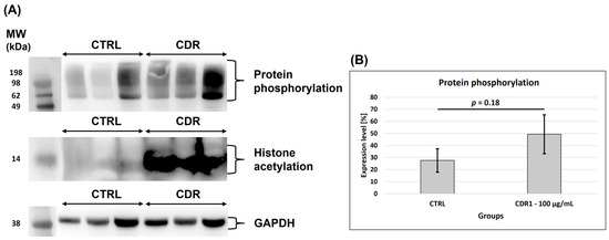 Due to the important regulatory function of ANP32A in phosphoprotein signaling [37,38] and gene transcription [13], we investigated if there are any qualitative as well as quantitative changes regarding protein phosphorylation and histone acetylation events in retinal tissues ± CDR1 treatment (100 µg/mL). Therefore, we performed a Western blot analysis of the respective retinal protein lysates ± CDR1 and screened for protein phosphorylation sites at serine (Ser) or threonine (Thr) residues and for acetylation motifs at lysine (Lys) residues on histones (see Figure 6). The densitometric analysis of the data revealed that CDR1-treated retinal tissues tended to show a slight increase in protein phosphorylation events compared to untreated CTRL explants but was not supported by statistical significance (p = 0.18, see Figure 6B). Also, histone acetylation was clearly increased by CDR1 treatment compared to untreated CTRL, as indicated by the enhanced chemiluminescent signal in the CDR1-treated replicates (around 14 kDa; see Figure 6A). However, a convincing quantitative analysis of this marker was not feasible due to increased chemiluminescent background emission of the membrane.