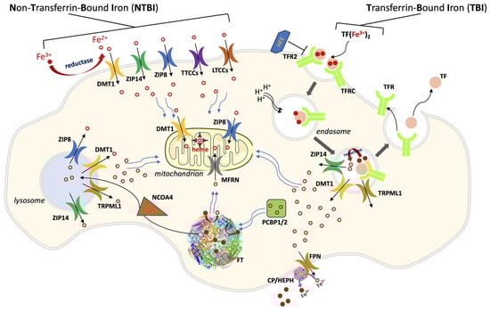 Several cell types, including neurons, hepatocytes and cardiomyocytes, can uptake iron in the form of the so-called non-transferrin-bound iron (NTBI), a potentially toxic form of the metal that results from pathological excessive entry of iron into plasma, for example in hereditary hemochromatosis and thalassemia major. Under these conditions, the saturation capacity of transferrin is exceeded and iron complexes with a number of low-molecular weight molecules, as well nonspecifically with other plasma proteins. Plasma NTBI is rapidly cleared by most cells through less selective but highly efficient iron transporters, including SLC39A14 (ZIP14 []), SLC39A8 (ZIP8 []), DMT1 [], L-type Ca2+ channels (LTTCs []) and T-type Ca2+ channels (TTCCs [,]). Comprehensive reviews on NTBI transporters can be found in the literature [,]. A large part of the ferrous NTBI is translocated into the mitochondria for the biogenesis of heme and Fe-S clusters. This is mainly allowed by mitoferrin (MFRN), a small transmembrane transporter (~300 residues) located on the inner mitochondrial membrane []. A role in mitochondrial iron trafficking has also been shown for ZIP8 [] and DMT1 [,,]. A general scheme of cellular iron traffic is depicted in Figure 1.