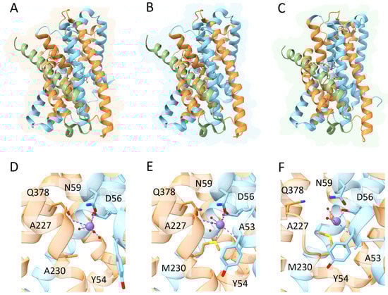 Schematic representation of the relevant conformational states and metal binding sites of Deinococcus radiodurans NRAMP. Top panels. Overall structure of the (A) inward-open; (B) occluded and (C) outward open conformational states of the transporter (PDB IDs 8E6I, 8E60 and 8E6N, respectively []). The first five helices are colored in gold, the second five helices in cyan and the additional C-terminal helix in green (see text for details). Bottom panels. Detailed view of the Mn2+ ion coordination sphere in the (D) inward-open; (E) occluded and (F) outward open conformational states. Mn2+ ion is shown as a purple sphere, water molecules as small red spheres and coordinating residues in stick representation.