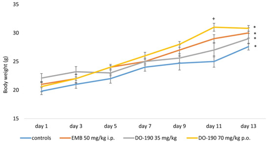 Changes in the body weight of animals treated with EMB, DO-190; + p < 0.05 vs. control; * p < 0.05 vs. first day of the experimental period.