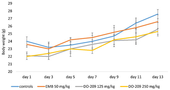 Changes in the body weight of animals treated with EMB, DO-209.