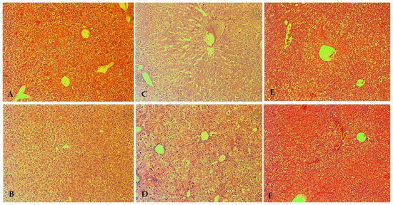 Pathomorphological findings in the liver of mice after oral administration of ethambutol (EMB) and nitrofuranes. Legend: (A) Control group—not treated; (B) EMB 50 mg/kg; (C) DO-190 35 mg/kg; (D) DO-190 70 mg/kg; (E) DO-190 800 mg/kg; (F) DO-209 3000 mg/kg. Magnification of the field 100×.