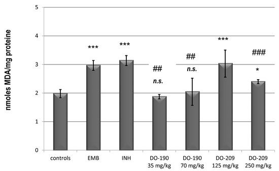 In the groups receiving both INH and EMB, the level of MDA increased by more than 35%. Doses of 35 and 70 mg/kg of compound DO-190 did not cause significant deviations compared to the control animals (p < 0.001). The endogenous MDA content of compound DO-209 at a dose of 125 mg/kg showed a comparable value with the INH and EMB controls, but at a dose of 250 mg/kg, the value was decreased.