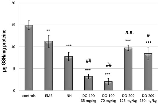 Significant dose-dependent decreases in the level of intracellular total glutathione were found in the DO-190-treated groups at both doses (Figure 8). Values were nearly 5-fold lower than those of untreated controls (p < 0.001), EMB (almost 3-fold at p < 0.01), and INH (>2-fold at p < 0.01). Administration of DO-209 resulted in less reduction of glutathione compared to both drug-control animals and the EMB- and INH-treated groups. The correlation coefficient between MDA and glutathione levels was −0.838 for DO-190 at a dose of 35 mg/kg, and 0.763 for DO-190 at a dose of 70 mg/kg. The correlation coefficient between both levels was—0.093 for DO-209 at a dose of 125 mg/kg, and 0.997 for DO-209 at a dose of 250 mg/kg, respectively. Glutathione supplementation also significantly reduced the level of lipid peroxidation and the risk of liver damage [15].