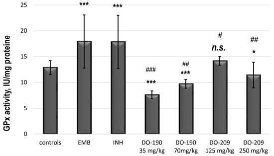 The activity of glutathione peroxidase in the liver supernatant of experimental groups. *** p < 0.001 vs. controls; * p < 0.05 vs controls; # p < 0.05 vs. INH 50 mg/kg; ## p < 0.01 vs. INH 50 mg/kg; ### p < 0.001 vs INH 50 mg/kg; n.s.—nonsignificant vs. controls. Results are expressed as mean ± SD (n = 6). The significance of the data was assessed using the nonparametric Mann–Whitney U test. Values of p ≤ 0.05 were considered statistically significant.