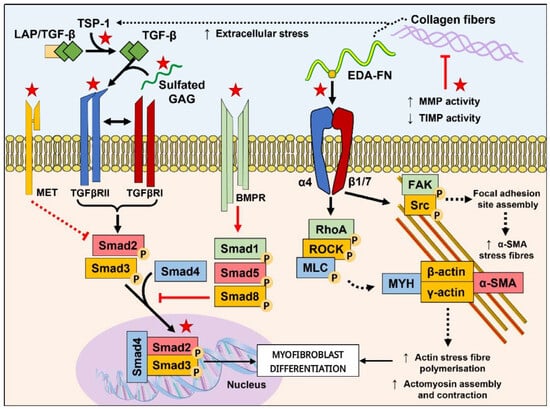 Prevalent tissue fibrosis is associated with end-stage diseases in multiple organs. Myofibroblasts are the cells with the foremost culpability for the elevated production and deposition of the disorganized collagen-rich extracellular matrix (ECM) that forms the pathological hallmark of fibrosis [1]. The chronic activation and prolonged presence of myofibroblasts within tissues are related to the progression of fibrosis [2,3]. The current consensus is that there are prerequisites for the generation of mature α-smooth muscle actin (α-SMA)-positive myofibroblasts, including stimulation of the transforming growth factor (TGF)-β1 pathway, generation of extracellular stress forces from ECM-mechanoreceptor interactions, and the presence of phenotypic priming biomolecules (extra domain A–fibronectin, EDA-FN; hyaluronan, HA; etc.). Myofibroblasts are heterogeneous in their origin, but the cell differentiation pathways and signaling cascades that drive differentiation are common among the precursor cells. Thus, there has been a surge in research activity directed towards developing therapeutics that target these shared myofibroblast-promoting pathways. We refer interested readers to our previous review that goes into extensive detail on the function and formation of myofibroblasts [4].