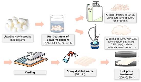 Silk fibers with varying sericin contents (0–24%) were obtained by controlling the degumming conditions (i.e., degumming method and time), as shown in Table 1. Bombyx mori silkworm cocoons were degummed by the high-temperature high-pressure (HTHP) method or the soap/soda method. The degumming ratio was calculated using Equation (1) [51,52]: