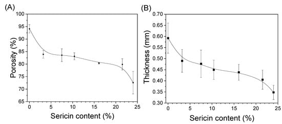 (A) Porosity (n = 3) and (B) thickness (n = 25) of silk nonwoven fabrics prepared with varying sericin contents.