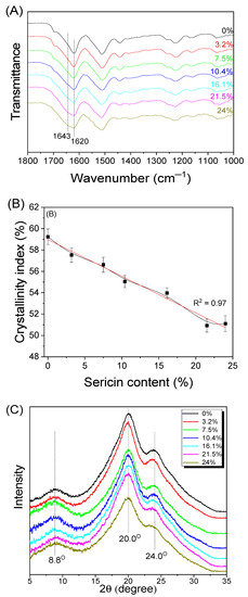 (A) Attenuated total reflectance–Fourier transform infrared spectra, (B) crystallinity indices, and (C) X-ray diffractograms of silk nonwoven fabrics with varying sericin contents.