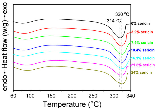 The thermal behavior of the silk nonwoven fabrics with varying sericin contents was evaluated through differential scanning calorimetry (DSC), and the results are shown in Figure 6. SNFS0 showed an endothermic peak at ~314 °C attributed to the decomposition of fibroin [70,71]. However, in the cases with sericin contents of 3.2–24%, the endothermic peak was observed at 320 °C. Considering that the endothermic peak was due to the thermal decomposition of silk fibroin, the thermal decomposition temperature of the silk nonwoven fabrics did not change with the variation in the sericin content. SNFS0 had a lower decomposition temperature (i.e., 314 °C) than other silk fabrics (320 °C) due to the partial disruption of the crystalline region of fibroin during the degumming process. That is, when sericin was completely removed from silk by degumming, the molecular weight (MW) and crystallinity of fibroin were affected [46,72,73].