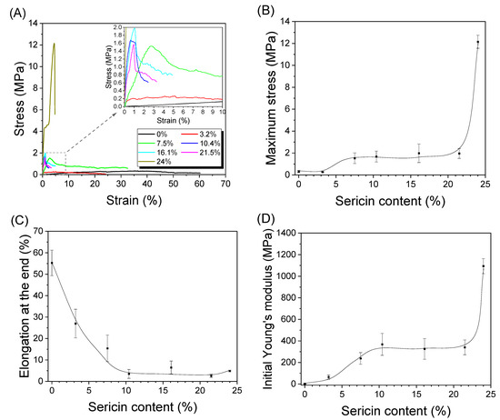 (A) Representative stress–strain curves, (B) maximum stress, (C) elongation at the end, and (D) initial Young’s modulus of silk nonwoven fabrics with varying sericin contents (n = 5).
