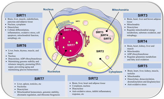 Distribution, subcellular location, enzyme activity, and functions of SIRTs.