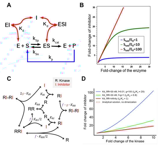 Figure 1. Increase in inhibitor doses required for constant inhibition of a kinase following its overexpression: insight from simple kinetic models. (A) Mass action scheme of phosphorylation of the substrate S by kinase E, which is inhibited by non-competitive inhibitor I. (B) Fold-changes in the drug dose (e.g., IC50) required to maintain the same inhibition level (e.g., 50%) are presented versus fold-changes in the abundance of the primary target for different enzyme/substrate ratios (see Section 2, Materials and Methods). (C) Schematic illustration of the kinase dimer model derived from [14]. (D) Increase in the IC50 drug dose following the increase in the abundance for a kinase that can dimerize in cases where the inhibitor induces dimerization (blue) or does not induce dimerizaton (lime green), compared to a kinase that does not dimerize (red). Calculated using the model presented in [14]. The dashed line (analytical solution, no dimerization) denotes the linear relationship between the drug dose and the abundance of a kinase derived from Equation (11).