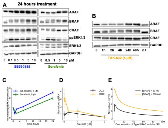 Figure 2. RAF overexpression in RAS-mutant cells. (A,B) RAF inhibitors increase the abundance of RAF isoforms in NRAS-mutant cells. (A) Growing MEL-JUSO cells were treated with increasing concentrations of Type I RAF inhibitor SB-590885 (left) or Type II RAF inhibitor Sorafenib (right), as indicated, for 24 h. DMSO served as a control. Cells were lysed and the expression of RAF isoforms and ERK activation were assessed using western blot. One representative replicate is shown. (B) Growing MEL-JUSO cells were treated with 4 μM Type II RAF inhibitor TAK-632 for the indicated times and analyzed as in (A). n.t.—non treated (C,D) Overexpression of RAF isoforms contributes to reactivation of ERK signaling. (C) Growing MEL-JUSO cells were treated with 6 μM SB-590885 (blue) or 9 μM Sorafenib (green) for the indicated times. Relative ppERK levels were quantified using the MSD Multi-Spot Assay ELISA System. (D) Overexpression of BRAFWT in CaCo-2tet cells (RASWT) was induced by addition of doxycycline for 24 h (orange). Uninduced cells (black) were used as control. Subsequently, cells were treated for a further 24 h with increasing amounts of TAK-632. Relative ppERK levels were quantified using Luminex ELISA, as described. The averages of three independent replicates are shown, error bars represent mean ± SEM. (E) Dependence of ERK signaling on the RAF abundance for cells with wild-type RAS ([RAS–GTP] = 25 nM). BRAF abundance is set to 50 nM (black) and 200 nM (orange). For both conditions, CRAF and ARAF abundances are set to 50 nM. The model predicts stationary responses of ERK signaling to Type II RAF inhibitor (e.g., TAK-632).