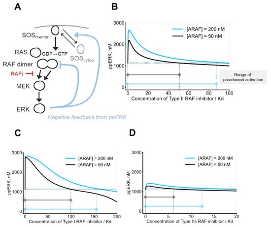 Figure 3. Structure-based model predictions: ARAF isoform upregulation results in the increase in the range of paradoxical activation. (A) Schematic overview of the processes described in the model. (BD) Dependence of ERK signaling on the ARAF abundance for cells expressing mutant RAS ([RAS–GTP] = 250 nM). ARAF abundance was set to 50 nM (black) and 200 nM (sky blue). For both conditions, BRAF and CRAF abundances were set to 50 nM. Dashed horizontal lines indicate basal ppERK levels for each condition. Vertical dashed lines denote inhibitor concentrations at which dose response curves drop below their basal levels. The model predicts stationary responses of ERK signaling to the Type II RAF inhibitor (B), Type I RAF inhibitor (C), and Type I½ RAF inhibitor (D).
