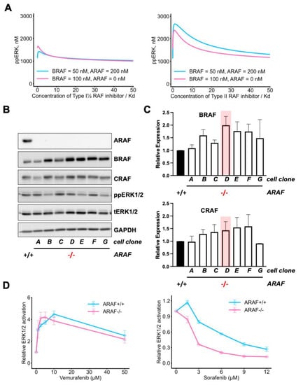 Figure 4. Knockout of one RAF isoform results in overexpression of other RAF isoforms to sustain ERK signaling. (A) Model predictions of dose responses and their dependencies on the RAF isoform abundances. Effect of Type I½ and Type II RAF inhibitors on ERK phosphorylation under ARAF knockout and BRAF overexpression. (left) [BRAF] = [CRAF] = 50 nM, [ARAF]= 200 nM. (right) [BRAF] = 100 nM, [CRAF] = 50 nM, [ARAF] = 0 nM. (B) ARAF+/+ or single-cell derived CRISPR/Cas9 knockout ARAF–/– MEL-JUSO cells were lysed, and RAF expression and ERK activation were analyzed by western blot. GAPDH served as a loading control. (C) Western blots of BRAF and CRAF expression levels in three replicates were quantified. Bar charts represent relative BRAF or CRAF expression in ARAF–/– cell clones. Error bars represent mean ± SEM. Clone #D (highlighted in red) was used for the dose response curves shown in (D). (D) Growing ARAF+/+ or ARAF–/– MEL-JUSO cells were treated with increasing concentrations of Vemurafenib or Sorafenib as indicated for 24 h. DMSO served as a control. ERK1/2 activation was assessed using the Magpix ELISA system. Charts represent relative ERK1/2 activation, error bars represent mean ± SEM, n = 3.