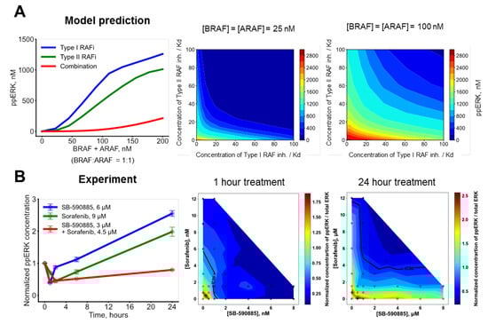 Figure 5. Our model predicts how combination of two RAF inhibitors overcomes drug resistance brought about by RAF overexpression. (A) Predictive simulations demonstrate synergy of inhibiting ERK signaling by combinations of Type I and Type II RAF inhibitors in RAF-overexpressing cells. (Left panel) Dependencies of ERK activation on BRAF and ARAF abundances for cells treated with 150·Kd Type I RAF inhibitor (blue), 200·Kd Type II RAF inhibitor (green), or a combination of 75·Kd Type I RAF inhibitor and 100·Kd Type II RAF inhibitor (red). The concentration of CRAF is 50 nM. (Middle and right panels) Isolines of steady-state ERK signaling responses to type Type I and Type II RAF inhibitors and their combinations. (Middle panel) [BRAF] = [ARAF] = 25 nM. (Right panel) [BRAF] = [ARAF] = 100 nM. For both conditions, [CRAF] = 50 nM. (B) ppERK signaling responses of growing MEL-JUSO cells to two structurally different RAF inhibitors and combination. (Left panel) Time course measured using MSD Multi-Spot Assay ELISA System in cells treated with 6 μM SB-590885 (blue), 9 μM Sorafenib (green), or a combination of 3 μM SB-590885 and 4.5 μM Sorafenib. (Middle and right panels) Dose responses to SB-590885, Sorafenib, and combination measured using xMAP assay for 1 h (middle) and 24 h of treatment, respectively.