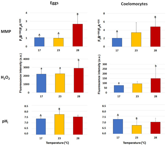 The pHi showed an opposite trend in the two cell types in the group exposed to 23 °C (Figure 1). In fact, in eggs, the pHi significantly (p < 0.01) increased in the group exposed to 23 °C compared to the group exposed to 17 °C (7.35 ± 0.20 vs. 7.73 ± 0.36), whereas, in the group exposed to 28 °C, it did not significantly differ from those of the other groups. In coelomocytes, the pHi significantly (p < 0.01) decreased in the group exposed to 23 °C (7.24 ± 0.28 vs. 6.72 ± 0.49), whereas, in the group exposed to 28 °C, it did not significantly differ from those of the other groups.