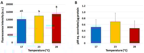 In coelomocytes, by increasing the temperatures, RNS levels progressively increased, with significant (p < 0.05) differences between the group at 17 °C and that exposed to 23 °C (12,374 ± 3340 vs. 14,140 ± 1571 a.u.) which further increased (p < 0.01) in the group exposed to 28 °C (15,017 ± 3050 a.u.) (Figure 2A). On the other hand, the TAC measured in coelomocytes did not show statistically significant differences between the experimental groups (Figure 2B).