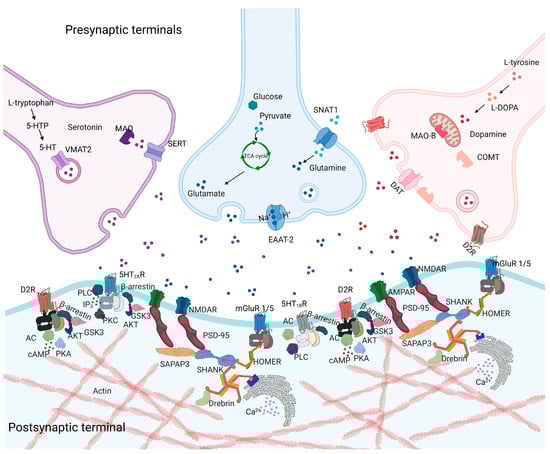 Several clinical and preclinical studies focus their attention on dopamine–serotonin-glutamate neurotransmission convergence points. Intracellular molecules, as well as receptor heterodimerization, are responsible for integrating different types of signaling in response to extracellular stimuli and drugs [146].