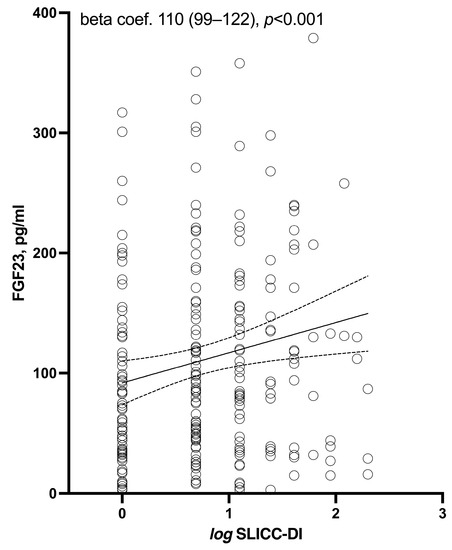 Relation between log SLICC-DI and FGF-23 serum levels.