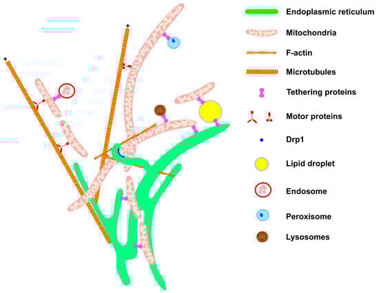 Figure 1. Mitochondrial network architecture. Mitochondria morphology is sustained and affected by interactions with other cellular structures. Communication with the ER (green) provides mitochondrial phospholipids and sustains calcium homeostasis. Interaction with the components of the cytoskeleton (F-actin filaments and microtubules, in orange) moves the mitochondria to specific regions of the cell, such as the appropriate location for cell division, or the periphery of the cell in the case of neurons. Motor protein kinesins and dyneins help to move mitochondria along the cytoskeletons of microtubules (for review, see McElroy et al., 2023) [70]. The endoplasmic reticulum wraps the mitochondria, thereby helping to recruit DRP1 (blue) on the mitochondrial membrane. Through communication with LDs (yellow), mitochondria are provided with fatty acids for β-oxidation and in turn provide energy for LD expansion. The contact between mitochondria and endosome (red) is important for mitochondria quality control through lipid and ion transference. Peroxisome (blue) and mitochondria communication allows the complementation of fatty acid oxidation and anti-oxidant system activation (for review, see Chen et al., 2020) [71]. Mitochondria–lysosome interaction (red and black) facilitates the direct transference of calcium from lysosomes to mitochondria. All these interactions are mediated by specific proteins that connect or tether the membranes.
