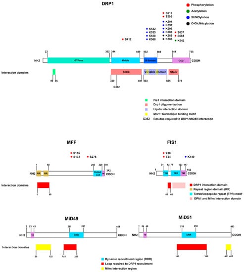 Figure 2. Mitochondrial fission proteins. The main players in mitochondrial fission are DRP1 and its mitochondrial adaptors. DRP1 is a dynamin-like GTPase that comprises the dynamin type G domain at the N-terminus (green), a middle domain (light blue), a B domain (blue), and a GTPase effector domain (GED) (magenta) at the C-terminus. Several post-translational modifications occur at DRP1, such as phosphorylation (represented in red), acetylation (green), SUMOylation (blue), and O-GlcNAcylation (black). The interaction regions in DRP1, where DRP1 interacts with its adaptors or itself, described to date are shown. FIS1 interacts with the dynamin-type G domain on DRP1. DRP1 oligomerization occurs via intermolecular stalk interaction. The stalk of DRP1 comprises the middle domain and the GED. The variable domain (also called insert B) contains the lipid interaction residues and the cardiolipin interaction region. A glycine residue in the stalk domain is required for DRP1 interaction with MiD49. MFF presents two domain repeats (R1 and R2), a coiled-coil domain (CC), and the transmembrane segment (TM). Interaction with DRP1 occurs via RR1 and RR2. FIS1 is formed by two tetratricopeptide repeat (TPR) motifs and a transmembrane domain. FIS1 interacts with DRP1 via residues located at the TPR motif. Also, the region in FIS1 that interacts with Mitofusins and OPA1 is shown. The regions of interaction with DRP1 are presented in FIS1 and MFF. MiD49/51 contains a transmembrane domain at the N-terminus and a Dynamin Recruitment Region (DRR). The region of interaction between MiD49 or MiD51 and Mitofusins is also shown [95,96,98,101,143,144,145,146,147].