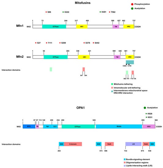 Figure 3. Mitochondrial fusion proteins. Mitofusins are dynamin-like GTPases comprising the GTPase domain at the N-terminus, followed by HR1, the transmembrane region (TM), and HR2 at the C-terminus. The phosphorylated and acetylated residues are shown in red and green, respectively. The HR domains are essential for the anti-tethering and pro-tethering states. Intramolecular interaction between HR1 and HR2 is associated with the anti-tethering conformation (red). Upon nucleotide binding, a conformational change exposes the HR2 domain to the cytosol, allowing interaction with the HR2 from adjacent mitochondria and tethering (represented in green). The GTPase domain also participates in the interaction for fusion [152,153,154,155,156]. An alternative model proposed that HR2–HR2 domain interaction occurs in the intermembrane mitochondrial space [150]. Isoform 1 of OPA (the long form) presents the transmembrane region at the N-terminus, followed by a coiled coil (CC), G domain (GTPase), middle domain, and GED. OPA1 oligomerization involves the G domain, middle domain, and GED domain [152,156,157].