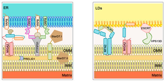 Mitochondria–lipid droplets contacts. Contacts between mitochondria and lipid droplets (LDs) are mediated by several proteins including PLIN1, PLIN5, MFN2, and MIGA2 [27] (see Section 4). The highly dynamic interactions between both organelles allow fatty acid migration from LD to mitochondria, where it is oxidized to produce ATP or heat. Furthermore, they are also needed for LD expansion, which stores fatty acids and lipid intermediates to avoid cellular lipotoxicity [28,29].