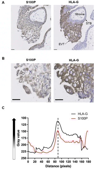 Serial sections of human placental tissue were stained for S100P and human leukocyte antigen-G (HLA-G) as previously described [,]. Briefly, sample tissue sections were deparaffinised, and heat-induced antigen-retrieval was carried out for 10 min using citrate buffer (pH 6.0) by heating with a microwave at 800 Watts. Blocking was achieved after incubating sections with BLOXALL (Vector Laboratories, Peterborough, UK) for 10 min and then with 2.5% (w/v) goat serum for 30 min. Staining was carried out using monoclonal anti-S100P or anti-HLA-G antibodies (Abcam, Cambridge, UK) incubated at 4 °C overnight (Supplementary Table S1). Following washing in PBS, the appropriate conjugated second antibody (Supplementary Table S1) was used. Images were acquired using NDP software and the staining was analysed using a Nano Zoomer XR scanner (Hamamatsu, Shizuoka, Japan). Analysis for the presence of S100P and HLA-G at the plasma membrane was carried out using ImageJ plot profile function (https://imagej.nih.gov/ij/docs/examples/calibration/ (accessed on 20 June 2019)). Matched images after staining for S100P and HLA-G were taken, and the same region of interest (ROI) was drawn across each cell with the membrane being placed at the midpoint of the region. Signal density was measured across a grey scale to reflect concentration of the epitopes.