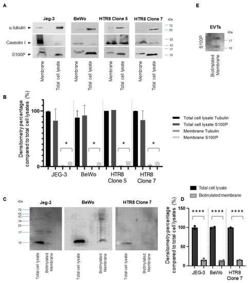 Next, we sought to confirm association of S100Pwith the plasma membrane either through differential separation of plasma membranes or by biochemical analysis. Cell lysates from trophoblast cell lines and the resulting protein samples from different subcellular locations were collected using differential centrifugation and separated on SDS-PAGE before Western blotting analysis using markers for both the cytoplasmic and membrane components (Figure 3A). Tubulin was used as a cytoplasmic marker [] and was found to be significantly enriched in the total cell lysate samples compared to the membrane compartment for all samples tested (Figure 3B), highlighting the fact there was little cytoplasmic contamination in the membrane fraction (Figure 3A,B). Caveolin I, a well-established plasma membrane marker [], on the other hand, was seen greatly enriched in the plasma membrane lane confirming the appropriate isolation of this cell compartment. Figure 3A shows that although the largest proportion of S100P was found in the total cell lysate sample, its presence is clearly seen in the plasma membrane fraction of all cell lines expressing S100P, regardless of the endogenous levels of expression. Quantification of the bands’ intensities in the different fractions for all cell lines tested indicated that there was a significant difference (enrichment was increased by 2.5- to 4-fold) in the levels of S100P in the membrane fraction, when compared to the tubulin marker (Figure 3B). Interestingly, the membranous pool of S100P is characterised by a band which appears to run slower than the proteins from the total cell lysates (Figure 3A) suggesting some type of post-translational changes and an active process to allow the protein to be localized in this cellular compartment. Furthermore, S100P is also present in the fraction of proteins representing the surfaceome of all three trophoblast cell lines (Figure 3C) and primary EVTs (Figure 3E) after biotinylation. However, levels of S100P observed in this fraction are much reduced when compared with those seen in total extracts (Figure 3D) and purification of this pool of proteins, suggesting the presence of S100P in the plasma-membrane/extracellular environment.