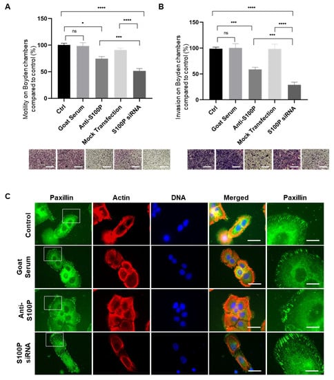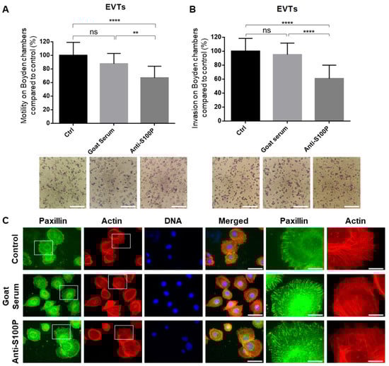 Motility and invasion experiments were carried out with or without the presence of the S100P antibody, prior to seeding primary EVT onto untreated Boyden chambers. Anti-S100P antibody treatment of primary EVT led to a reduction in both migration (~35%, p < 0.0001; Figure 6A) and invasion (~40%, p < 0.0001; Figure 6B) compared to the mock treated samples.