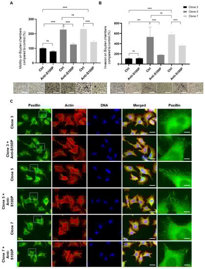 Similar experiments were carried out in two independent HTR8/SVneo clonal cell lines with high S100P expression (clone 5 and clone 7) as well as a control clone with undetectable levels (clone 3). As previously reported [], S100P expression in both of the HTR8/SVneo cells (clone 5 and clone 7) leads to a significant 2–3-fold increases in motility when compared to the control counterpart (p < 0.0001, Figure 5A). Treatment of control HTR8/SVneo clone 3 cells with the anti-S100P antibody did not affect their motility (p = 0.62; Figure 5A), validating the antibody’s specificity., However, migration of either HTR8/SVneo clone 5 or clone 7 cells was significantly reduced by around 35% (p < 0.0001; Figure 5A) albeit not to the level observed in clone 3 cells.