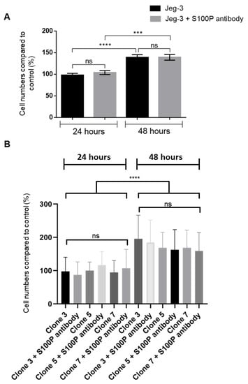 High levels of S100P have been linked to increased cell viability and cellular proliferation in JAR cells, but not other choriocarcinoma cell lines (Jeg-3 or BeWo) [] or in extravillous trophoblast (HTR8/SVneo) []. We therefore explored whether the anti-S100P antibody’s effects on motility and invasion could be explained by changes in cell viability. As shown in Figure 7, S100P antibody-treated Jeg-3 (Figure 7A) and the different HTR8/SVneo clonal cells (S100P expressing clones 5 and 7 as well as the control counterpart clone 3, Figure 7B) resulted in similar cell numbers to mock treated and untreated counterparts at both 24 h and 48 h, indicating that neither cell viability nor proliferation were compromised by the presence of the antibody.