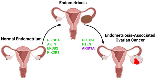 62. Samartzis, E.P.; Noske, A.; Dedes, K.J.; Fink, D.; Imesch, P. ARID1A Mutations and PI3K/AKT Pathway Alterations in Endometriosis and Endometriosis-Associated Ovarian Carcinomas. Int. J. Mol. Sci. 2013, 14, 18824–18849. [Google Scholar] [CrossRef]