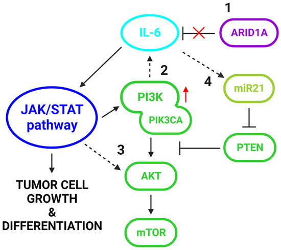 Figure 2. Crosstalk between IL-6 signaling and the PI3K/AKT/mTOR pathway in EAOC. (1) IL-6 is a physiological target of ARID1A tumor-suppressor activity, which is frequently deficient in EAOC [75]. (2) IL-6 expression is promoted by PI3K, including its catalytic subunit PIK3CA, which is commonly amplified in EAOC [101]. (3) IL-6 triggers the JAK-STAT signaling pathway, which, in turn, has been shown to interact directly with the p58a regulatory subunit of PI3K and to upregulate the expression of AKT [102,103,104]. (4) IL-6 induces the expression of miR-21, a microRNA that impedes PTEN translation and is increased in EAOC [105,106]. ARID1A, AT-rich interaction domain 1A; IL-6, Interleukin 6; PI3K, Phosphatidylinositol-3-kinase; PIK3CA, Phosphatidylinositol-4,5-bisphosphate 3-kinase catalytic subunit alpha; JAK, Janus kinase; STAT, signal transducer and activator of transcription protein; AKT, Protein kinase B; miR-21, microRNA-21; PTEN, Phosphatase, and tensin homolog.