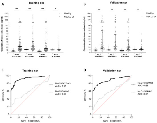Quantification of circulating methylated nucleosomes in NSCLC samples at diagnosis, and in healthy samples. The concentration of circulating H3K27Me3, H3K36Me3, H3K9Me3, or H3K4Me2 nucleosomes was measured, using chemiluminescent Nu.Q® immunoassays, in human K2-EDTA plasma samples from NSCLC patients at diagnosis (DI) and from healthy donors. (A,B) Jitter plot analysis representations of the circulating H3K27Me3, H3K36Me3, H3K9Me3, and H3K4Me2 nucleosome levels in NSCLC samples, compared to healthy samples, in the training (A) and validation (B) sets. The whiskers represent the 25th–75th percentile with median. ** and **** represent p-value < 0.01 and < 0.0001, respectively, calculated using the Mann–Whitney U test. (C,D) Receiver-operating characteristic (ROC) curve analysis of the circulating H3K27Me3 and H3K4Me2 nucleosomes for the discrimination of NSCLC at diagnosis, versus healthy samples, in the training (C) and validation sets (D). The areas under the curve (AUC) for the targeted nucleosome markers are indicated in the legend. The red line indicates the theoretical random chance. The corresponding significance p-values for the circulating H3K27Me3 and H3K4Me2 nucleosomes are, respectively, <0.0001 and 0.0021 for the training set, and p < 0.0001 and p = 0.0063 for the validation set.