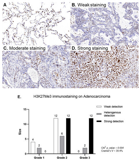 Representative H3K27Me3 immunostaining (10x objective). (A) Representative image of normal lung tissue. (B–D) Representative images of weak- (B), moderate- (C), and high-intensity (D) immunostaining from a lung adenocarcinoma. (E) H3K27Me3 expression as a function of the grade.